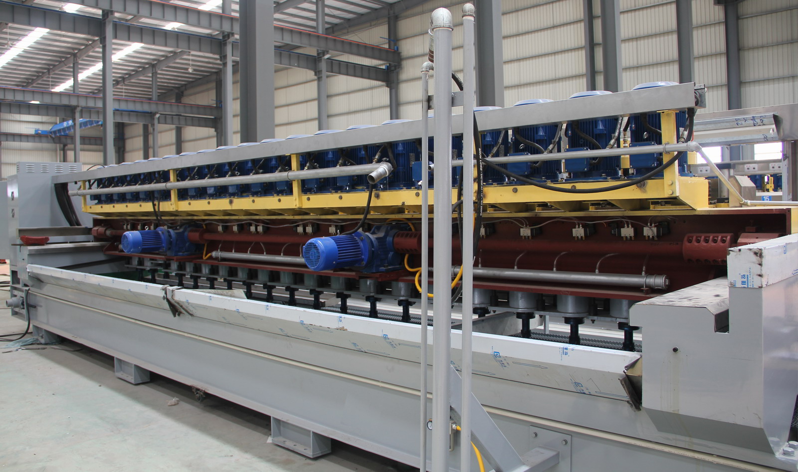 1.該機采用外方設計方案及自動系統,結合國內市場需求,該產品性能穩定,高產量、低維護。 2.該機選用標號鑄件、鋼材。軸承、電機、減速器等部件選用德國、日本、臺灣等品牌電器。 3.該機控制系統采用PLC終端控制,以液晶顯示觸摸屏終端為人機界面進行參數設定,設備運行過程中設有故障提示等等。該機適用于花崗石條板的連續磨削及拋光。板材輸送帶、磨盤橫移梁的工作速度均為變頻器調速;磨盤工作壓力、板材的磨削寬度在設定值范圍內可調。本機可對板材形狀自動識別,每個磨盤(磨頭)可根據識別板材的形狀自動升降,同時對板材磨削進行跟蹤記錄。性能穩定、故障率低等優點。