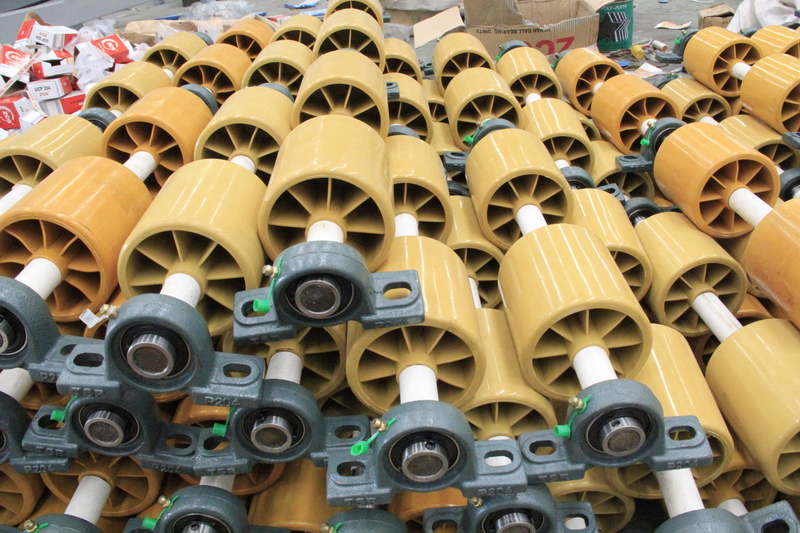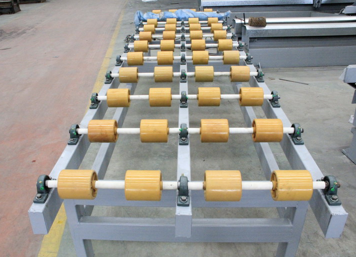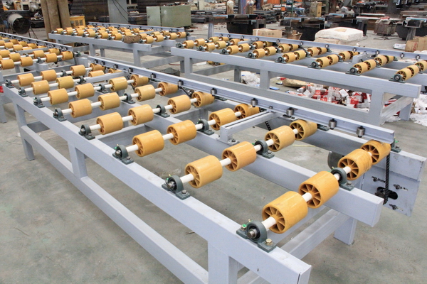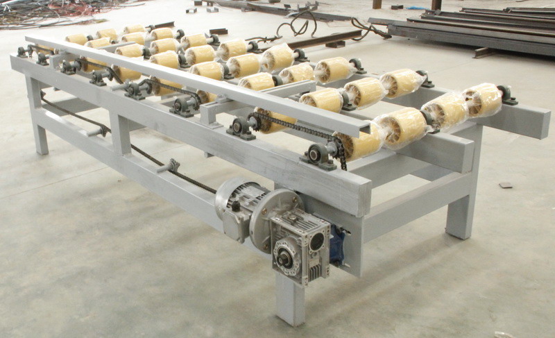 自動輸送板材、采用蝸輪蝸桿減速器+鏈條 驅動、輸送棍子采用改性尼龍制造,抗腐蝕、 高強度。