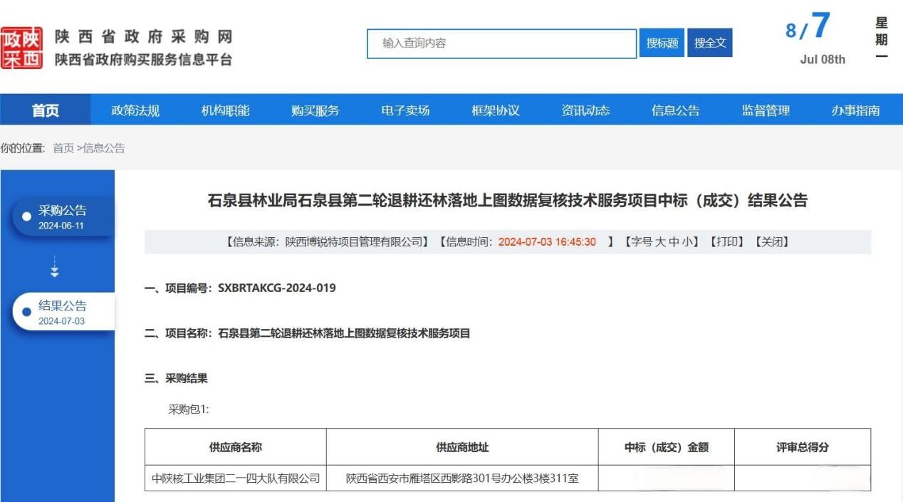 近日,據陜西省政府采購網公告獲悉,公司水工環院成功中標“石泉縣第二輪退耕還林落地上圖數據復核技術服務項目”。