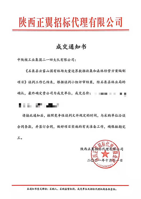 10月11日,接陜西正翼招標代理有限公司成交通知書,在石泉縣林業局委托開展的《石泉縣云霧山國有林場矢量邊界數據收集和森林經營方案編制項目》競爭性談判中,公司力挫其他競爭對手,最終被確定為成交單位。