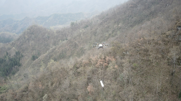 該項目地處陜南湖北交界地區,工區地形切割強烈,山勢極為陡峭,垂直高差近650米,普通地表物探手段根本無法施工。項目組采用了長航時油電混合動力多旋翼無人機,搭載高精度鉀光泵磁力儀等先進設備,通過自主研發的起伏地形航線規劃軟件技術進行超低空仿地形飛行,有效保障了數據的采集質量。